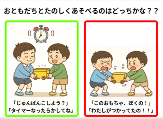 これを習慣化するするために、みんなが集まる時に絵カードを使ってソーシャルスキルトレーニングをしたり、お友達同士のおもちゃの取り合いが起きたときにも、絵カードを使ってタイマーなどで時間を計って順番交代する重要性を子どもたちに伝えます。