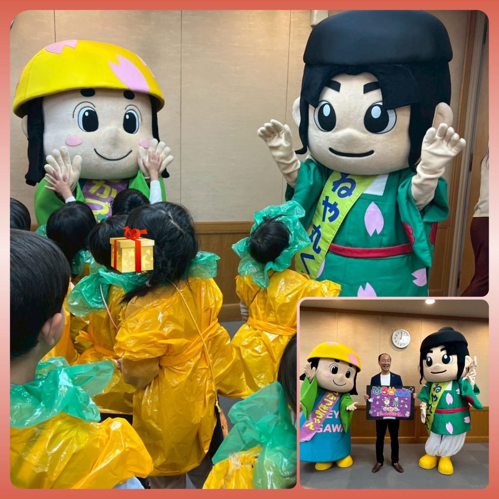 たくましくて正義感が強く、優しいまなざしでみんなに安心感を与えてくれる、ねや丸くん🌟市長さんの表敬訪問を終える頃には、子供たちみ〜んなと仲良しになりました❤️